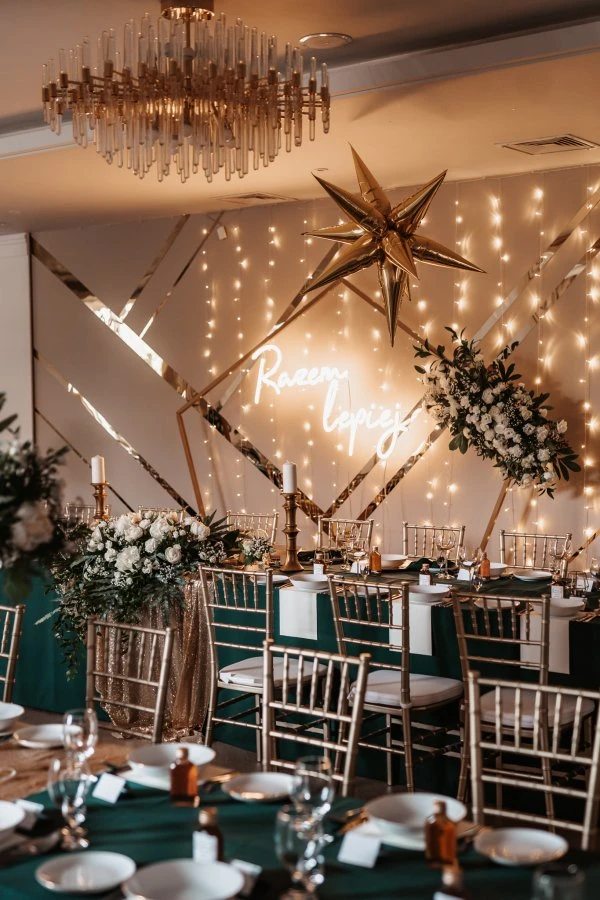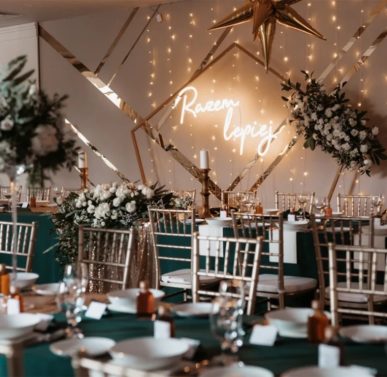 Sala może zostać zaaranżowana według indywidualnych życzeń by podkreślić styl i osobowość Młodej Pary. Organizujemy także dodatkowe atrakcje które sprawiają że każda chwila jest wyjątkowa od nastrojowego oświetlenia po oprawę muzyczną i eleganckie dekoracje stołów.